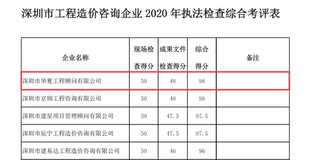 我司在深圳市工程造價咨詢企業2020年執法檢查中綜合考評得分榮獲第一,此次榮譽的獲得離不開公司嚴密科學的質量管控制度和員工們專業的技術能力。未來,我司將一如既往地秉承“以信立業,以德興業”的經營理念,繼續執行深圳市建設工程計價標準和相關規范,以更加精湛的技術為客戶提供工程造價咨詢服務。