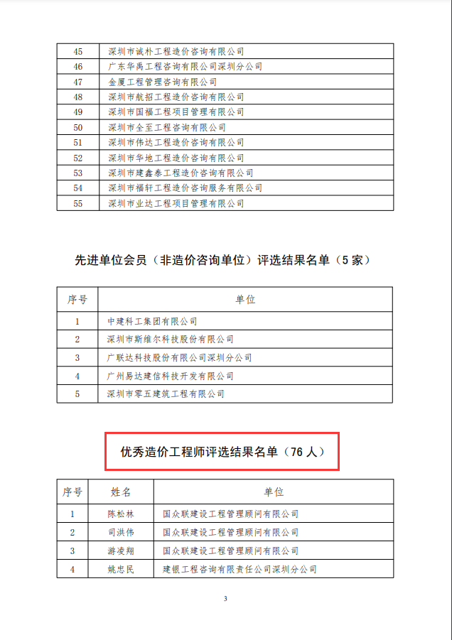 深圳市造價工程師協會年度評優旨在表彰在造價行業管理規范、服務質量優、社會信譽好、經營效率高的造價咨詢單位及優秀的個人會員,我司積極參與協會組織的各項評優工作,獲得了多項榮譽: