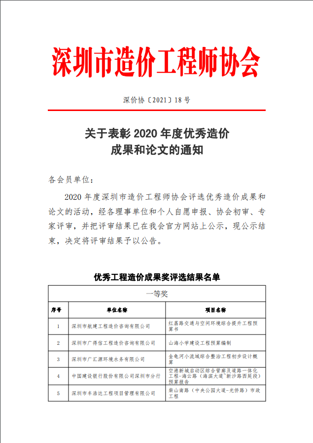 1.我司完成《觀瀾派出所招標控制價編制》造價咨詢成果,榮獲深圳市優秀工程造價成果 一等獎