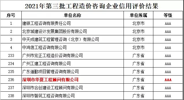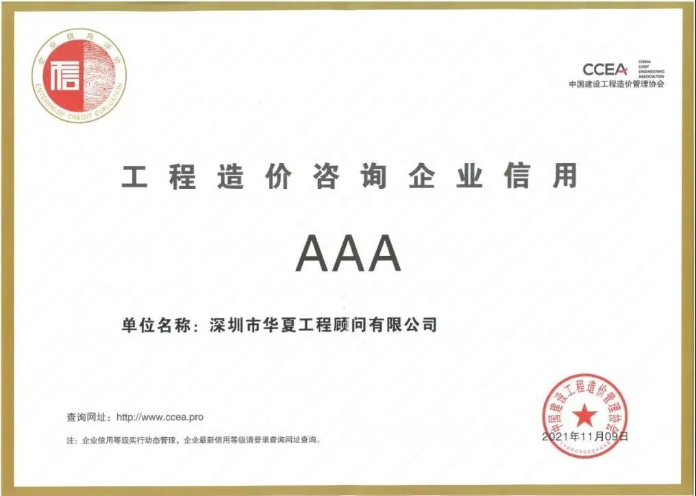 近期,中國建設工程造價管理協會(以下簡稱:中價協)公布了2021年第三批工程造價咨詢企業信用評價結果。經企業申報、各省級工程造價行業協會(中價協專業工程委員會)初評,中價協組織專家終評,深圳市華夏工程顧問有限公司獲評中價協工程造價咨詢企業信用評價最高等級——AAA級!
