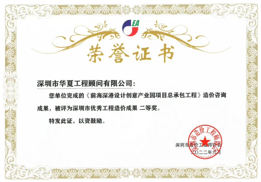 3.我司“前海深港設計創業產業園項目總承包工程”榮獲優秀造價咨詢成果獎二等獎